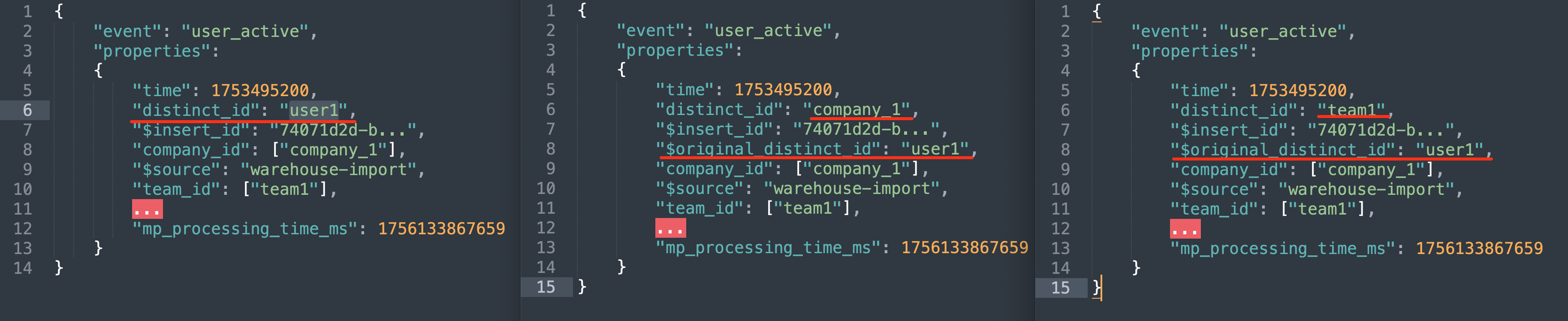 By default, Mixpanel counts unique users by distinct_id. Group Analytics allows you to uniquely count events by an alternative identifier, such as company ID, invite ID, or another value shared by a group of individuals with different distinct_ids. Below you will see an example of an event coming into a project that has company_id and team_id set up as separate group keys. You will see how, starting with a single event being ingested (on the left), by switching the identifier you’re analyzing on, the event can be read with said identifier as the user key to do the analysis on: